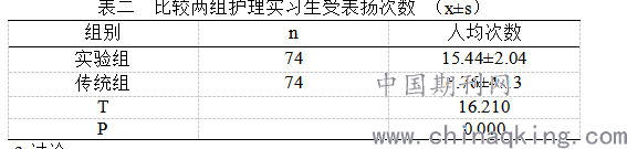 实验组护理实习生受表扬的人均次数明显高于传统组,(p<0.05),见表二。