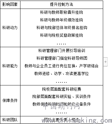每所高职院校的影响因素比重不同,所需要调整的重点也不同,但最终目标是保障科研工作的成果服务社会,服务学校。