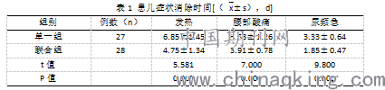 联合组各项症状消失时间明显短于单一组,差异具有统计学意义(P<0.05),见表1。