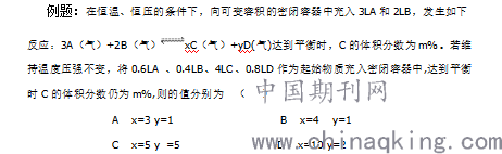 解析:恒温恒压下只要满足加入组份的配比相等即为等效,当x=5?y =5?时,4LC、0.8LD完全转化到方程式的左边,生成A、B分别为2.4L、1.6L,此时A、B的总量分别为3L、2L,则A、B间的配比为3:2,即不但配比相同,而且同种组份的物质的量相同,则同种组份的初始浓度一定相同,与原平衡等效,C的体积分数仍为m%。