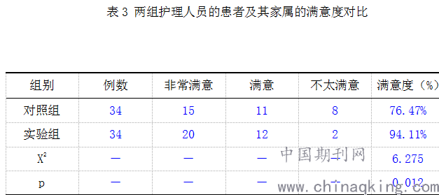 实验组护理人员的患者及其家属的满意度明显高于对照组护理人员差异具有统计学意义(p<0.05),具体见表3。