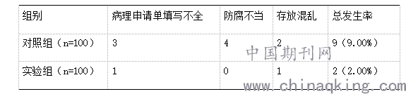 在实验结果中发现两组标本均有不同程度的安全问题,但实验组中的标本安全缺陷次数发生率仅为2(2.00%),低于对照组的9(9.00%),差异显著(P<0.05);