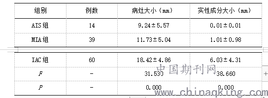 三组患者的病灶大小、实性成分大小均有明显的差异,AIS组显著优于MIA组和IAC组(P<0.05),见表1。