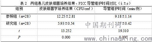 2.2 两组患儿皮肤细菌学培养结果、PICC导管维护时间
