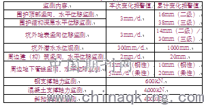 根据本工程业主单位的要求、周围环境、基坑本身的特点及相关工程的经验,按照安全、经济、合理的原则,测点布置主要选择在2倍基坑开挖深度范围内布点,主要监测项目为周边环境监测和围护结构监测。周边环境监测包括:周边地下管线竖向位移、水平位移监测、周边建(构)筑物竖向、水平位移监测、坑外地表竖向位移监测。围护结构监测主要内容为围护顶部竖向、水平位移监测、围护结构深层水平位移监测、支撑轴力监测、坑外潜水水位观测。同时,根据相关文件要求,各监测数值报警指标如下表所示:
