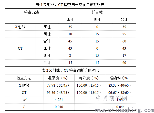 以纤支镜诊断结果为金标准,对比分析X射线检查、CT检查的诊断价值,检查出支气管异物为阳性,否则为阴性。对比X射线、CT诊断敏感度、特异度、准确性。