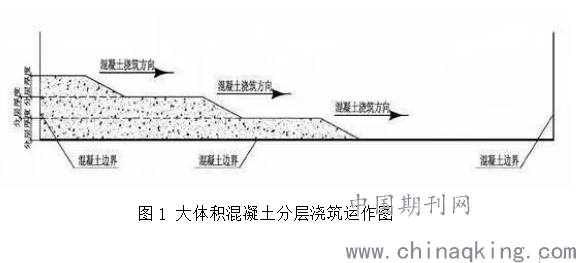 目前,分层持续浇筑法是大体积混凝土建设运作中使用率最高的方式。此种浇筑方式的核心特征便是借助混凝土层面道开展散热,有助于大体积混凝土的浇筑块的温度管控。与此同时也便于混凝土后期振捣运作的高品质开展,如此便更好保障了大体积混凝土的浇筑品质。如下图1所示,为大体积混凝土分层浇筑运作图。