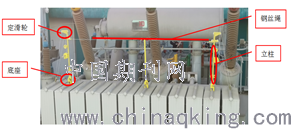 (2)“一正一反”保证立柱平衡。在边立柱顶部装设定滑轮,滑轮内设钢丝绳导向槽,可以有效避免钢丝绳的横向滑动;在边立柱的外侧,增加“拉线”定滑轮,改变拉力方向,使边立柱反向受力;一正一反,边立柱平衡受力,保证了立柱的垂直稳固。