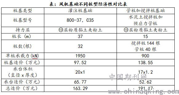 由上表可知,在上部风机荷载不变的情况下,单个风机基础选择桩径为800mm 的桩基及承台造价比桩径为 600mm 的桩基承台费用要低,在同等桩长条件下,桩单位立方米混凝土承载力直径 800 桩与直径 600桩要低。若考虑打桩费用,则 800 直径桩经济优势更为明显。综合比较桩基费用、承载力、长细比、桩数调整方便及灌注桩施工难易等因素,本工程推荐采用直径 800 灌注桩,桩基持力层可根据风机的具体位置选择层⑧、⑨、⑩作为基础持力层。层⑧工程性状一般,当作为持力层时,应进行必要的强度和变形验算;层⑨工程性状较好,但只有局部分布;层⑩工程性状一般,作为持力层时,应进行必要的强度和变形验算,桩端进入持力层深度≥2d。管桩规格为抗拔灌注桩 Φ800,平均桩长为 37m。