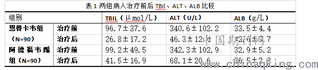 两组病人治疗前后TBil、ALT、ALB均有不同程度的改善,其中恩替卡韦组病人的ALB以及ALT的改善效果较为明显,改善程度要好于阿德福韦酯组的病人(p<0.05),详情见表1,