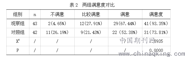 观察组和对照组的满意度分别为95.83%、72.92%,(P<0.05)。见下表2: