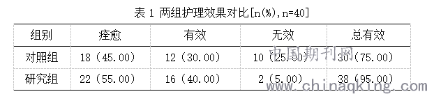 治疗后,研究组护理效果95.00%,高于对照组的75.00%,两组比较差异明显(P<0.05),详情见表1。