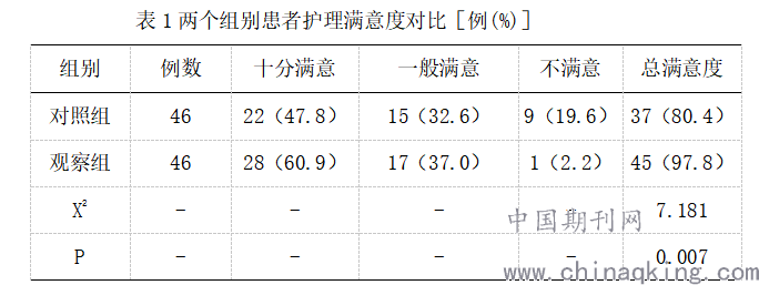 1.3观察指标 对比两个组别患者护理满意度,使用医院内部制定的护理满意度评估表评估患者对护理的满意度,主要有十分满意、一般满意以及不满意三个主要层次,总满意度为十分满意度后一般满意度之和。