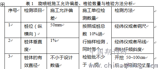 2.3高压旋喷施工技术要点。市政道路工程软土路基施工过程中,高压旋喷桩施工工艺的有效应用,可以取得较好的施工效果。利用高压旋转喷嘴,向软土路基当中喷射水泥浆液,让水泥浆液和软土中的水充分混合,保证水泥加固作用得到更好发挥,提升软土路基承载能力。为了避免市政道路软土路基出现渗漏现象,施工人员可采取联锁桩施工技术,但是,此种施工方法需要较大的施工空间,不会轻易发生振动。施工人员还要特别注意以下问题:(1)如果市政道路软土路基深度比较大,可以采取单管旋喷施工方式,提升压力与泵量。(2)在喷射注浆期间,时刻观察冒浆情况,并结合土层条件,调整喷射注浆量,冒浆量不能超过注浆量 20%,一旦超过 20%,或者完全不冒浆后,施工人员要找到具体原因,并采取有效处理措施。如果软土当中的空隙比较大,出现不返浆现象,可以在浆液当中加入适量的速凝剂,如果冒浆量较大,则可以提高回转速度  。(3)在旋喷注浆施工之前,施工人员对高压设备与管路系统进行全面检查,设备压力与流量要满足设计方案要求,管路系统密封性能符合规定要求,管道与喷管内部禁止出现杂物。(4)施工完毕的注浆管,要及时用清水冲洗干净。水泥浆液水灰比要满足设计要求,严禁任意更改,禁止使用过期水泥。(5)施工过程之中,针对施工所使用的各类机械设备,要定期进行校验。(6)施工结束后,检测人员对旋喷桩施工质量进行全面检查,了解旋喷桩施工允许偏差,具体的检查内容见表 1。