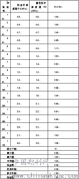 (3)当水泥固化土芯样抗压强度范围0.5~0.7MPa即抗压强度较低时,准件强度/圆柱形强度为在1.0。