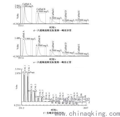 3)峰形异常。峰形异常通常可能由于溶液pH变化、六通阀故障、载液使用错误、溶液配制错误等引起。这个时候需要逐个排查,检查配制方法、试剂容器、试剂是否污染或试剂是否过期等情况,有些样品要求加酸或加碱进行保存,需要检查方法文件进行确认。