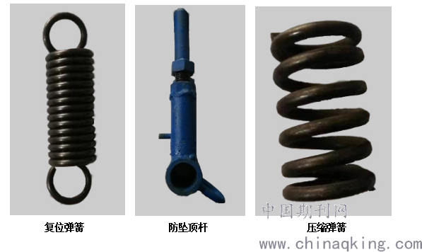 复位弹簧外径φ24,弹簧丝径φ2.5,圈数n=16.5,复位弹簧安装在防坠顶杆与附着支承前端横梁上,始终拉住防坠顶杆防止顶杆后翻。