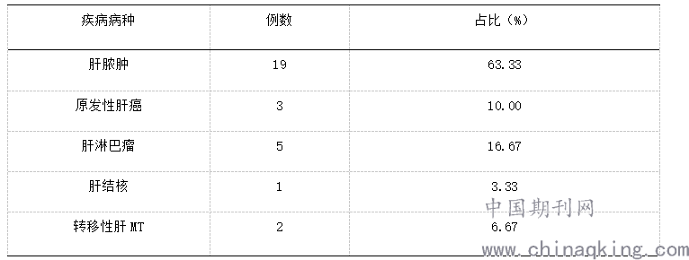 实性为主病灶活检病理结果:镜检查后发现3例患者显示原发性肝癌,5例患者为肝淋巴瘤,1例患者为肝结核,2例患者为转移性肝MT,详见表1。另外,本次研究的30例患者进行穿刺时均为一次穿刺成功,无患者出现并发症。
