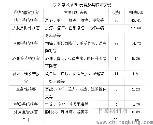 ADR累及系统或器官损害前三位的分别是消化系统损害、皮肤及附件损害、神经系损害。见表2。