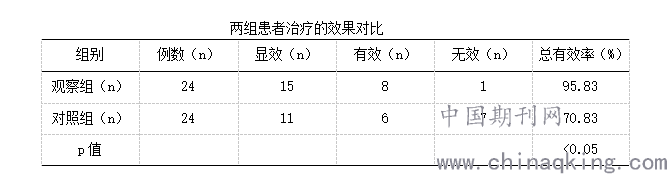 观察组患者的治疗总有效率95.83%(23/34),显著高于对照组患者的治疗总有效率70.83%(17/27),(P<0.05);详细如下表。