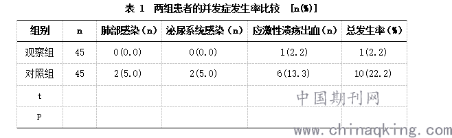 观察组的并发症发生率为 2.2%,明显低于对照组的22.2%,统计学软件检验有意义(P<0.05)。见表1。