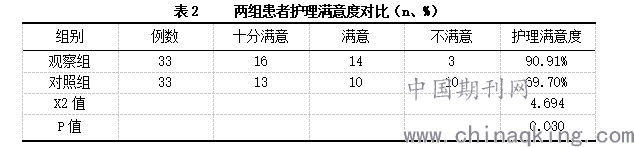 观察组患者的护理满意度明显高于对照组,两组对比显著(P<0.05)。(详见表2)