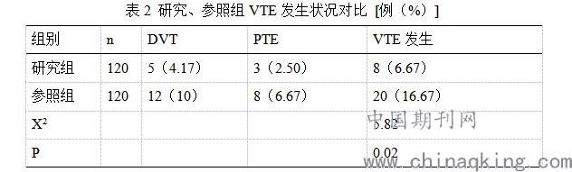 研究表明研究组VTE发生率为6.67%,参照组为16.67%,研究组明显低于参照组,差异具统计学意义(P<0.05)。详细数据如表2所示。