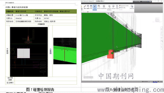 在大体量复杂造型幕墙施工中,预埋构建与幕墙面层材料常常会出现碰撞现象,施工单位会因为碰撞现象产生停工、返工等损失。运用BIM技术对幕墙设计中可能出现的碰撞点进行检测,对该可能产生碰撞的环节进行修正,汇总形成碰撞检测报告(图7),可以避免施工中才发现问题,停工协调耽误工期。碰撞报告中给出了偏差范围,工程师对碰撞的位置及偏差数据进行分析。如图8所示。