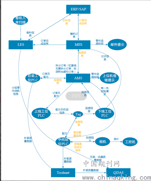 通常包括发动机生产过程中的压装、拧紧、试漏、测试等数据。质量数据一般是经专业设备服务器采集传递至站位PLC,再通过FRID/TAG或直接传递至AMS。