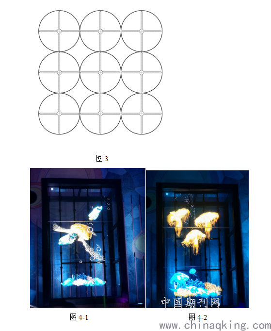 以2020年大连国际海鲜展为例,案例中应用的设备是中型全息广告机联屏,播放端的结构图如图3所示,设备由若干台65H单体播放机组成,配有金属支撑架和外防护罩,控制端包括局域网PC端控制和云端控制,可自由控制素材内容的播放展示。案例中所涉及的展示元素由三维动画、特效所构成,如海豚戏水题材,水母、海虾游动题材以及其他海洋生物互动的展示画面。其中各个种类的海洋生物制作由三维模型师运用常规的三维元素制作技术完成,动画师在模型资产完成后加以动作设计,特效师根据整体画面的构思进行特效模拟和解算并加以合成。项目管理人员在视觉素材完成后根据全息设备的具体硬件参数进行微调以匹配设备播放终端的展示效果,全息广告机联屏在实际应用前需根据内容测试效果决定是否在素材制作中修改方案或者通过硬件设备进行参数上的调整,以满足现场使用时要达到的整体视觉效果。通过用户反馈,现阶段的三维技术制作已基本满足了用户对于全息视觉效果的要求,同时用户也提出了相关建议。第一,三维技术在全息设备中的表现十分出色,但通过设备展示的效果并不能很好地被摄影机取样,未达到理想的广泛宣传效果 ,需改良全息硬件设备的相关参数以便于和大众摄像技术相融合,第二,目前的三维视觉素材大部分依然是机械式地展示,没有很好地与现场布局氛围以及场地实际内容线性地相连,所以在三维资产制作和技术合成的应用上需结合实地考察才能使全息视觉表现更上一层楼,第三,三维技术应结合对应的音效才能达到体验度更高的全息视听效果,三维视觉元素若与听觉元素相辅相成,会使用户达到更深一层的沉浸与消费意识。案例应用的现场效果如图4所示。