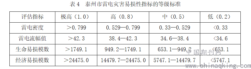 各区(县)的雷电灾害易损性指标主要体现该区城发生雷电灾害时在某一方面可能造成损失量的大小,尚不能给出雷灾易损性大小的直观概念。为弥补上述不足,将雷电灾害损性指标用极高、高、中、低4个级别来描述,按照灾害学通常方法,并结合泰州市雷电灾害的实际情况,赋予各等级如下的定值:极高为1.0,高为0.8,中为0.5,低为0.2。分级方法采用气象学统计分析中的分级统计方法,其核心思想是:首先将7个区(县)的某个指标值从小到大按顺序排列,并按第1,3组2个记录,第2组3个记录的方法分为3组数据。第n(n=1,2,3)组中的最大值和第n+1(n=1,2,3)组的最小值的平均值作为第n(n=1,2,3)级的最大值和第n+1(n=1,2,3)级的最小值。泰州市各项雷电灾害易损性指示分级标准如表4所示。分级完成后,首先判断每个区(县)每个指标的所属级别,获取相应指标值,然后将指标值按照适当权重最后获取综合易损性值。