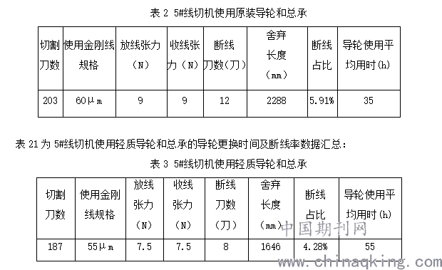 通过轻质导轮和总承使用前后的数据对比发现,当切割张力由9N减小到7.5N后,断线率有所降低;采用新材质的导轮使用时间也由原先的35小时增加到55小时。