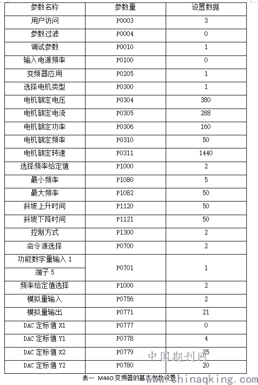 本着节省成本、满足控制要求的原则,此次变频恒压供水自动控制系统的变频技术改造中,我们利用了能源环保部煤气柜加压机扩容时替换下线闲置的西门子M440型185KW的变频器。在变频器投入系统使用前,首先要p0970=1将变频器复位,所有参数回到工厂设定的缺省设置值,以消去变频器中存储的一些参数设定值,之后再连接电机完成安装上电进行设置调试。由于变频器需要设置的参数较多,每个参数有一定选择范围,如果设置不当,变频器不能正常工作,会导致输出的数据误差大或是错误,所以必须对相关基本参数进行正确的设定。通过反复调试,本系统中西门子M440型变频器参数设置如表一所示。