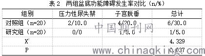 从盆底功能障碍发生率来看,研究组压力性尿失禁、子宫脱垂等盆底功能障碍总发生率低于对照组,P<0.05。见表2:
