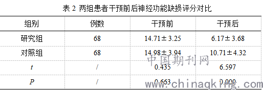 两组患者NIHSS评分在干预前相比,无统计学差异,P>0.05;两组患者NIHSS评分在干预后均有所改善,研究组改善更显著,有统计学差异,P<0.05,见表2。