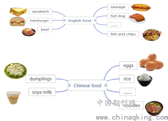 然后让学生根据思维导图,发散性的想到English food和Chinese food.在这个教学设计环节中,学生发挥了想象力和创造力,活跃了课堂的气氛,形成了积极思维模式。