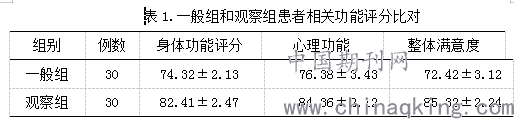 通过进行一般组和观察组患者相关功能评分比对,其中一般组身体功能评分为74.32±2.13,心理功能为76.38±3.43,整体满意度评分为72.42±3.12。观察组患者身体功能评分为 82.41±2.47,心理功能评分为84.36±2.12,整体满意度评分为85.32±2.24,其中观察组患者相关功能评分显著优于一般组患者。