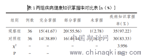 观察组疾病健康知识掌握率为97.22%;对照组为83.33%,前者显著高于后者,有显著统计学差异,P<0.05,如表1所示。