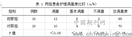 结合表1所示,20例观察组患者中满意为12例,基本满意为5例,不满意为3例,临床护理总满意度为85%;20例对照组患者中满意例数为10例,基本满意为4例,不满意为6例,临床护理总满意度为70%。观察组患者的护理满意度明显高于对照组患者,两组患者的护理满意度比较差异显著,具有统计学意义(P<0.05)。