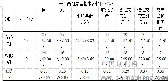 随机选取2019年5月至2020年7月我院下呼吸道感染患者80例。纳入标准:(1)临床症状、体征、实验室检查、胸部X线检查符合下呼吸道感染的诊断标准;(2)患者及家属同意本次研究并签写知情同意书。排除标准:(1)无认知能力;(2)精神疾病患者;(3)严重脏器疾病;所有患者资料差异无统计学意义(P>0.05)。