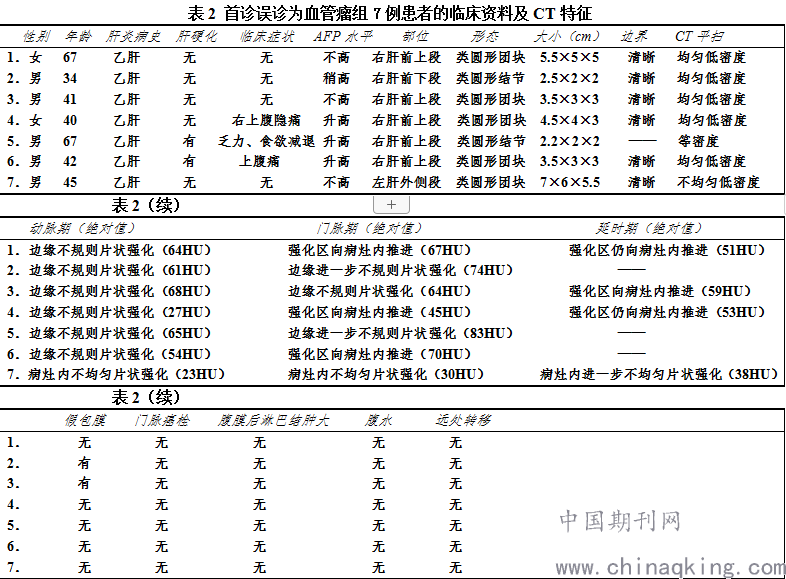 首诊误诊为血管瘤组7例共7个病灶,4例行肝三期扫描,3例行肝双期扫描。7例患者的临床资料及CT特征如表2所示。