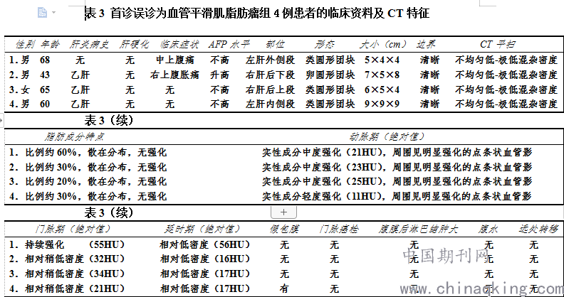 首诊误诊为血管平滑肌脂肪瘤组4例共4个病灶,4例均行肝三期扫描。4例患者的临床资料及CT特征如表3所示。