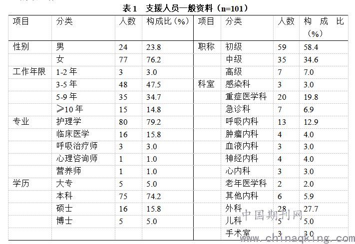 2.2.2队员结构 经遴选后共确定援鄂医疗队队员101人,男24人(23.8%),女77人;年龄24~54(32.72±5.09)岁;硕士、博士共21人(20.8%);高级职称7人。按行政职务分为领导组和支援组,领导组共5名人员,由副院长担任支援业务总队长,感染性疾病 科主任担任医疗业务负责人,护理部副主任担任护理业务负责人,医院感染管理科主任担任感控业务负责人,后勤管理科主任担任后勤业务负责人,负责前后方对接、筹备物资、确定支援路线,并参考国家指南及安徽、湖北、浙江经验,并结合本单位成功救治案例,制定医疗管理条例、医疗护理规范及院感流程等运行流程,向上级部门及时汇报抗疫情况。救援组医护人员主要来自重症医学科、急诊科、呼吸内科;内科医护人员65人(64.4%);护理人员80人(72.9%)、临床医师16人(15.8%)、呼吸治疗师3人(3.0%)、心理咨询师1人(1.0%)、营养师1人(1.0%)。在人员配置时,由领导小组根据人员新老搭配、医护专业搭配、专业协同组合的原则,医生与护士按照1∶5的数量配比。