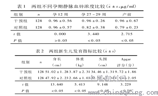 锌在许多生物功能中起重要作用,包括蛋白质合成,细胞分裂和核酸代谢。缺锌与生长迟缓,细胞介导的免疫功能障碍、认知障碍以及不良妊娠结局有关[4,5]。已有报道指出妊娠早期缺锌会导致流产,早产和神经管缺陷。怀孕后期的缺乏会对神经元产生负面影响并且会导致大脑功能受损以及行为异常。孕妇补充适量的含锌胶囊可改善孕妇孕中、晚期的锌营养状态,显著改善新生儿的生长发育状况[6](见表1表2)。