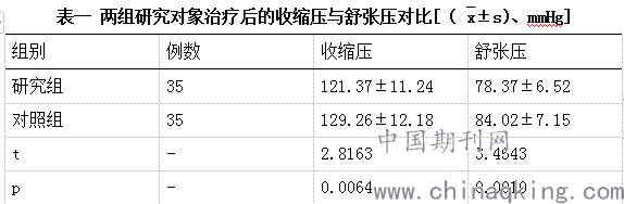 治疗前,两组研究对象的收缩压与舒张压指标对比差异无统计学意义(p>0.05),治疗后,研究组患者的收缩压和舒张压指标优于对照组,数据间对比差异明显(p<0.05),研究具有统计学意义,详见表一: