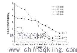 永磁发电机在运行过程中,谐波电动势的矢量相加的。此时相关人员如果将定子槽倾斜一定程度,那么槽内的电枢绕组轴极有可能向周边感应的谐波电动势相位不同。因此,电动机运行时的部分谐波电动势极有可能会出现相互抵消的现象。当定子槽的倾斜程度设置为0.1~1.6的槽距,步长为0.1槽距时,永磁发电机空载时感应电动势的谐波幅值变化曲线如下所示。