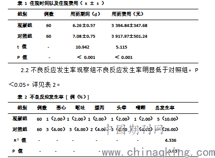 2.1用药期间以及用药费用观察组明显低于对照组,P<0.05。详见表1。