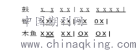 ,然后请之前的木鱼组尝试敲出这个节奏,这次要求比较简单,只需要他们能连续、整齐的演奏该节奏型,而其他学生则扮演老鼠成亲场面的观众,来表现拜堂成亲时的热闹场面。这个环节进行之后,有学生主动提出:固定的节奏型可以通过力度、速度的变化让它富有层次感,因此教师趁热打铁,请个别学生大胆尝试与表现,木鱼组的同学分别用中速和快速、强力度和弱力度演奏了这个节奏型。这个教学探索学生能从中体会:简单的节奏通过音乐要素(速度、力度)的变化对于场景表现具有推动作用,还能提升音乐表现能力与创造力,更能真切地感受到中国民族音乐文化的魅力。