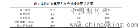 设计要求是研制直升机的基本依据和设计出发点,直升机的相应设计要求的制定,首先需要对军用和民用市场进行广泛调研和分析,同时还需要结合当前的科技水平。根据调研,共轴无人直升机主要用于执行空中巡逻监察、通讯中继布站、武器实验、物资补给、电路检修等任务,有效载荷和任务航程是其最主要也是最重要的设计指标,除此以外,为保证无人直升机的生存能力和高原工作能力,还需要无人直升机具有较快的机动速度和较高的悬停升限。下面根据中小型共轴无人直升机的以上特点,查阅现有国内外共轴无人直升机飞行性能数据,见下节内容,给出设计要求范围,如表1所示。