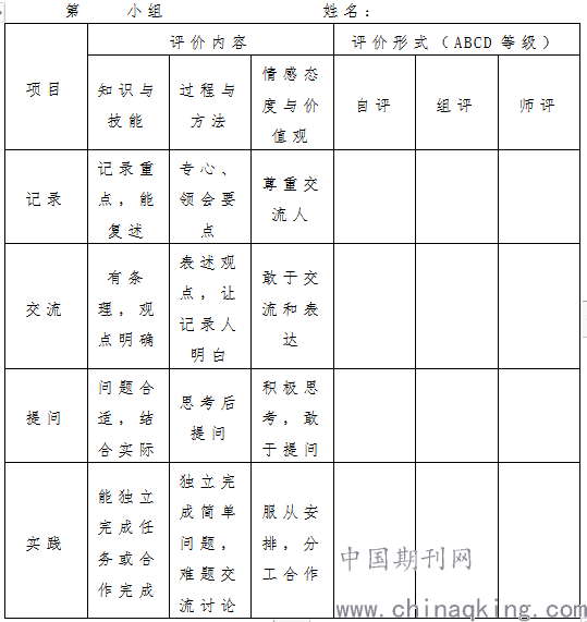 结合《生物课程标准》中的培养目标,在评价的过程中,应该把个人评价与小组评价有机的结合起来,把学习过程评价与学习结果的评价也结合起来,例如: